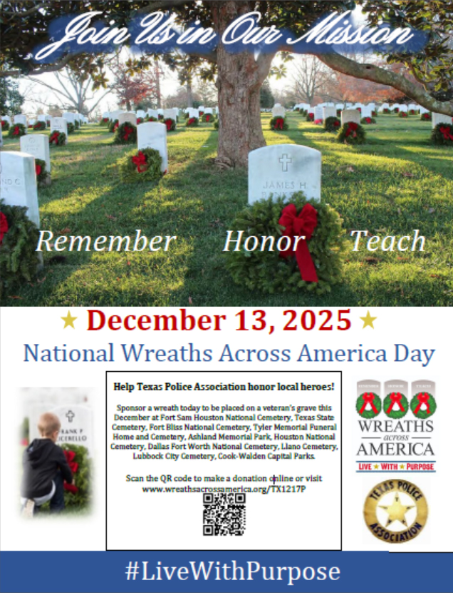 The Texas Police Association has partnered with Wreaths Across America in honoring our veterans for National Wreaths Across America Day on December 13th, 2025. Sponsor a wreath today to be placed on a veteran’s grave this December at Fort Sam Houston National Cemetery, Texas State Cemetery, Fort Bliss National Cemetery, Tyler Memorial Funeral Home and Cemetery, Ashland Memorial Park, Houston National Cemetery, Dallas Fort Worth National Cemetery, Llano Cemetery, Lubbock City Cemetery, Cook-Walden Capital Parks. Purchase price is $17.00 per wreath. TPA will receive a portion from every wreath purchased under this program.